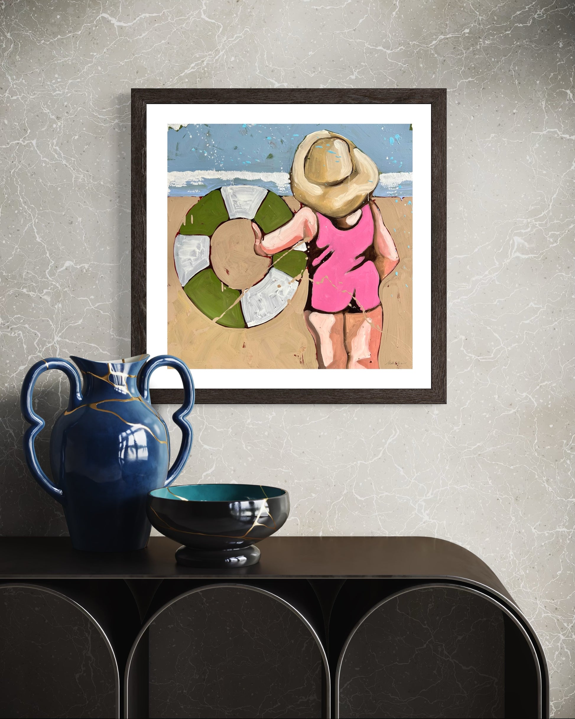 Una bambina in piedi sulla sabbia guarda l'orizzonte stringendo un salvagente come un amuleto. La scena racchiude la fragilità dell'infanzia e la promessa silenziosa della sicurezza: un equilibrio tra curiosità e paura, tra desiderio e protezione.