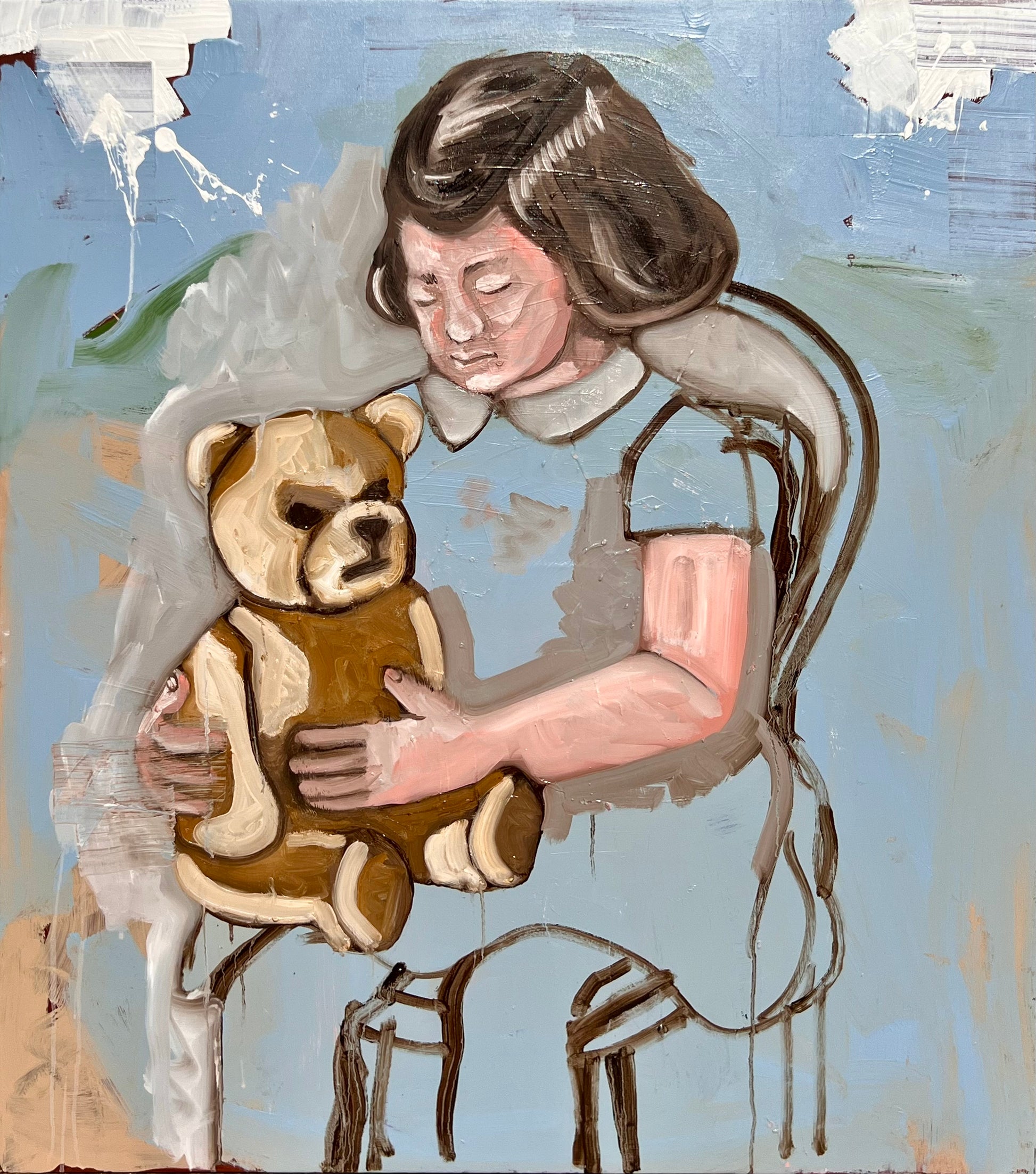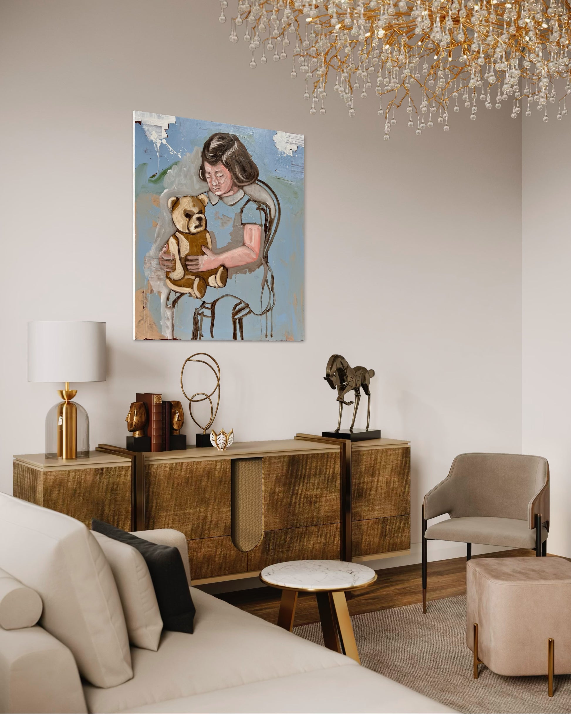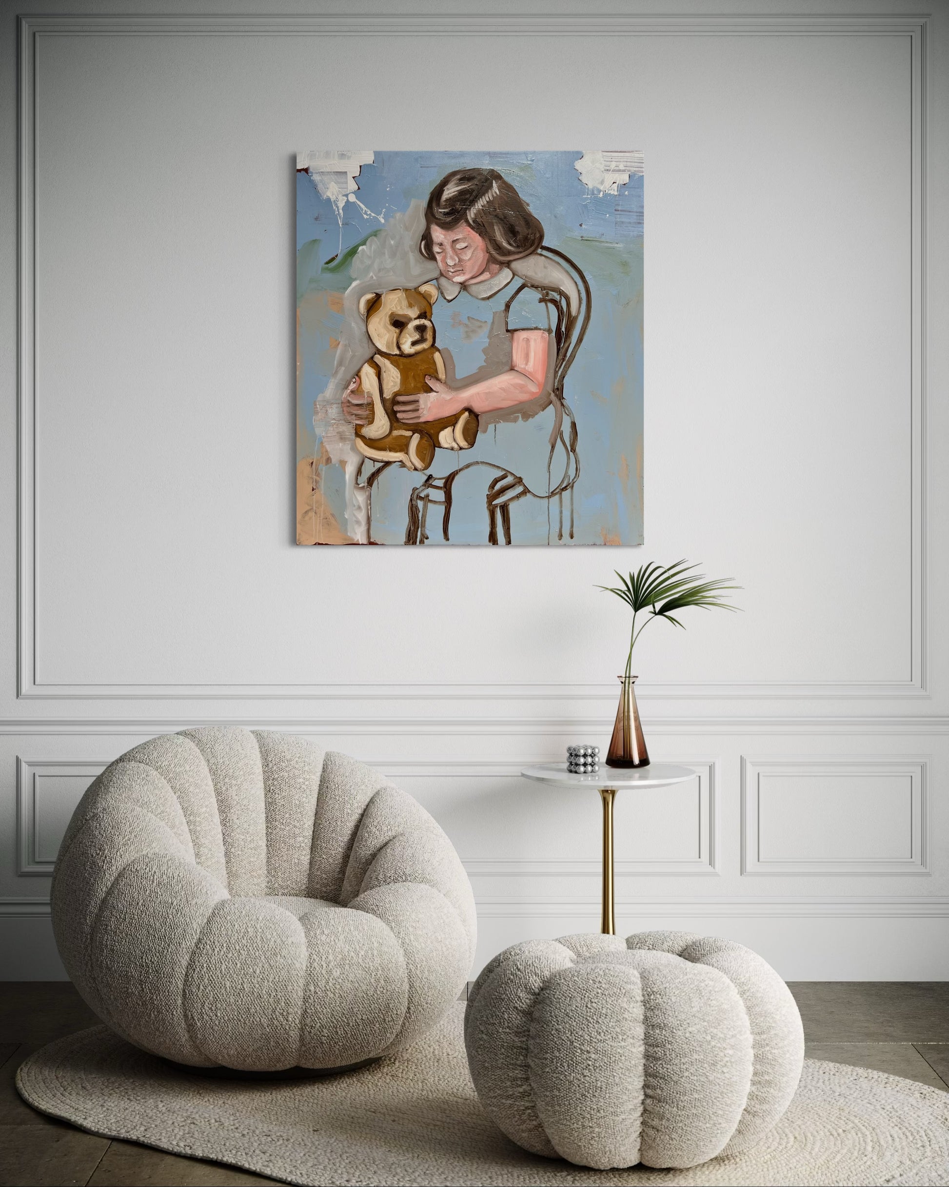 Un'opera intensa che racconta l'infanzia come un luogo sospeso tra ricordo e sogno. La bambina stringe un orsacchiotto, simbolo di affetto e protezione, in un dialogo silenzioso che diventa memoria condivisa.