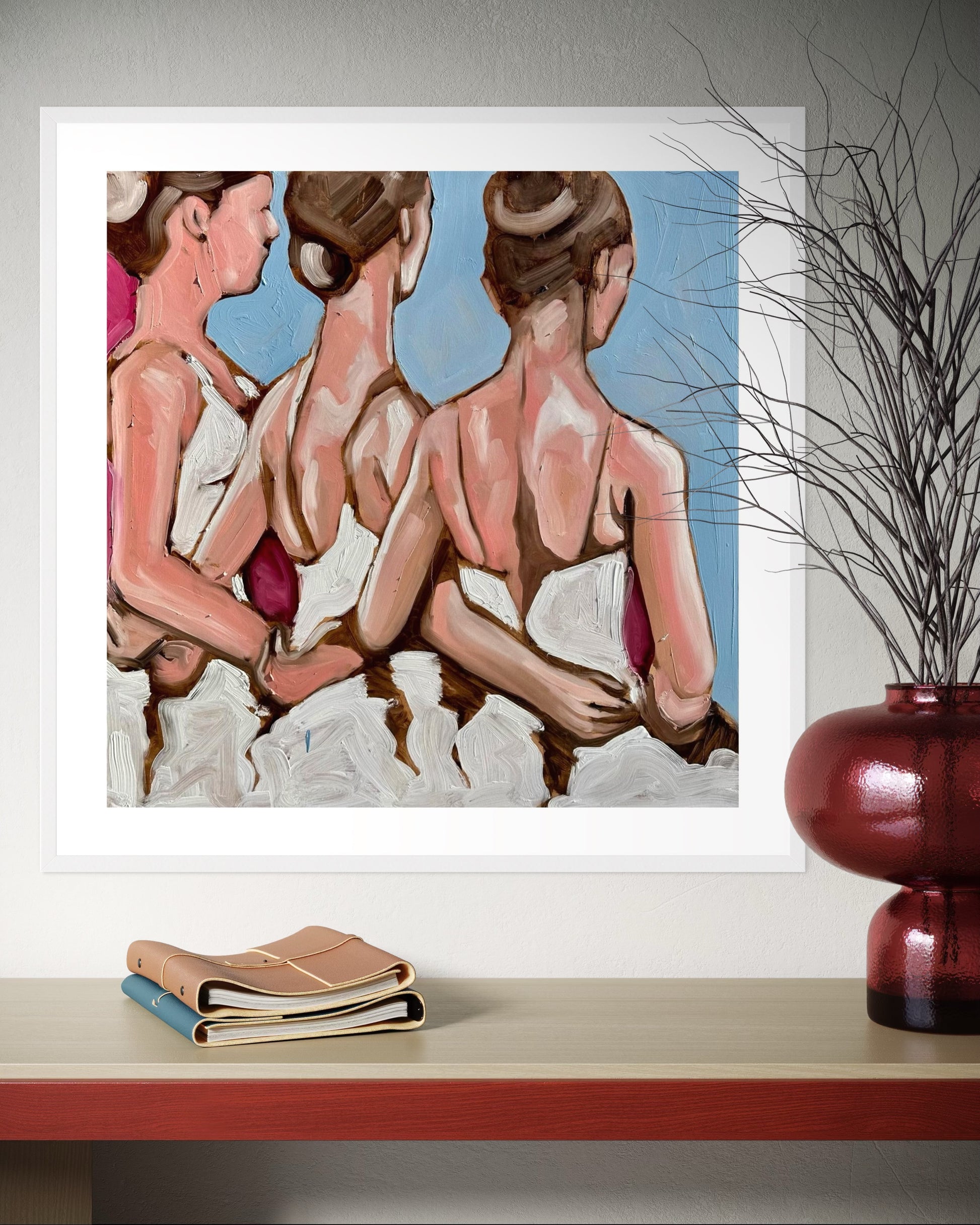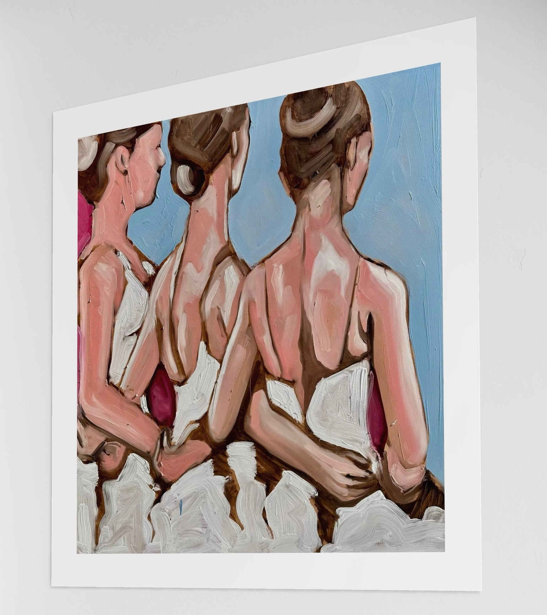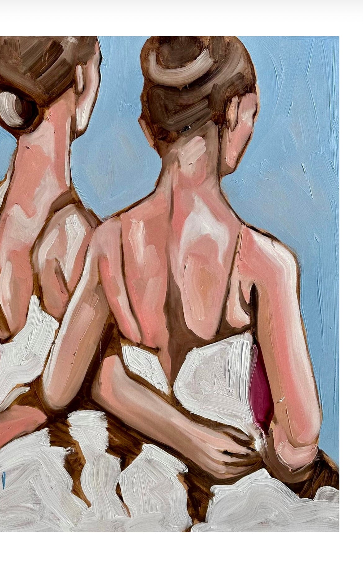 Un’immagine intensa e armoniosa che cattura la delicatezza delle ballerine colte di spalle, unite in un gesto di vicinanza e grazia.