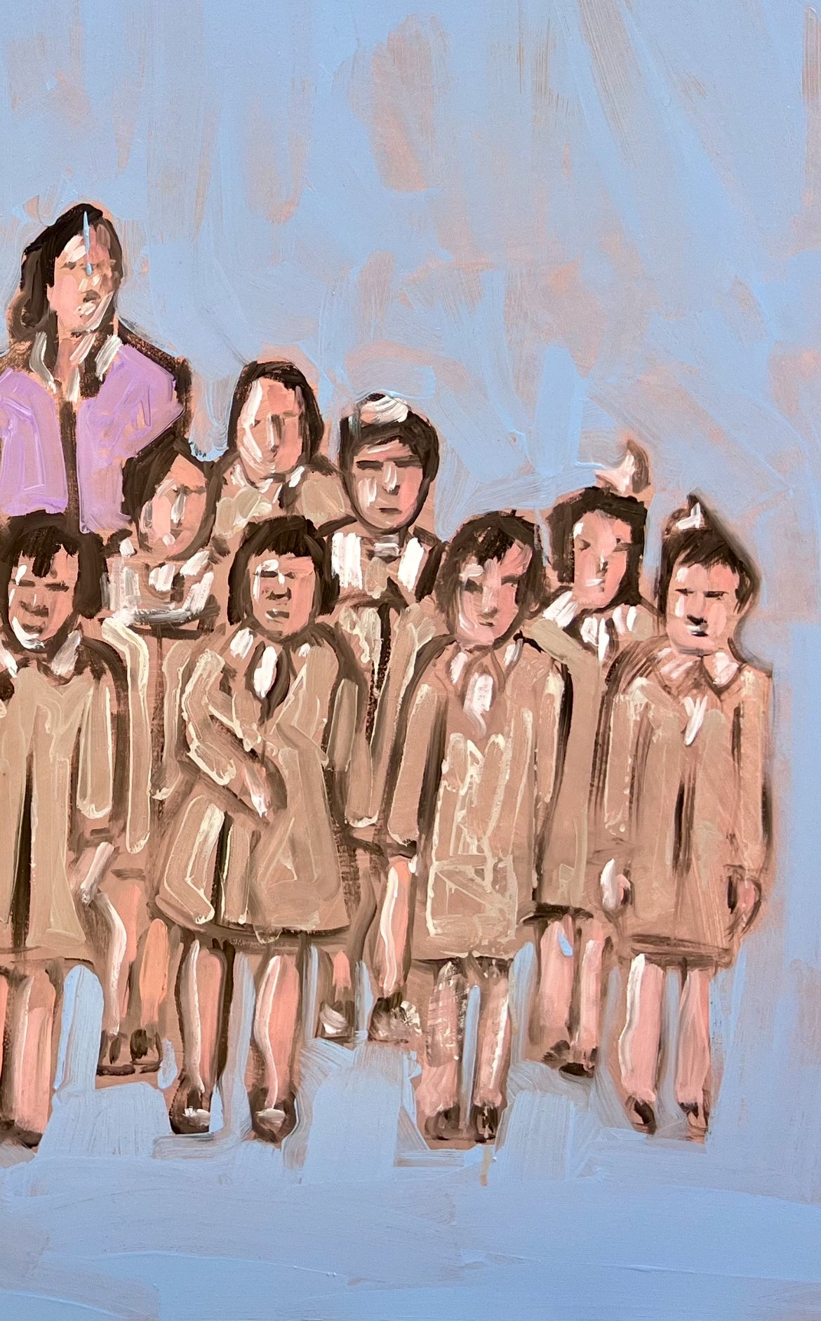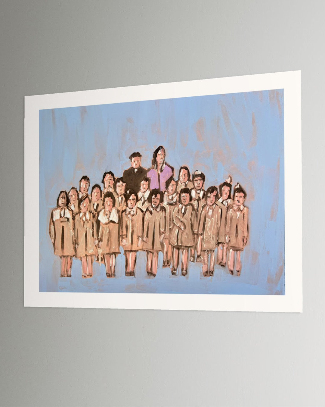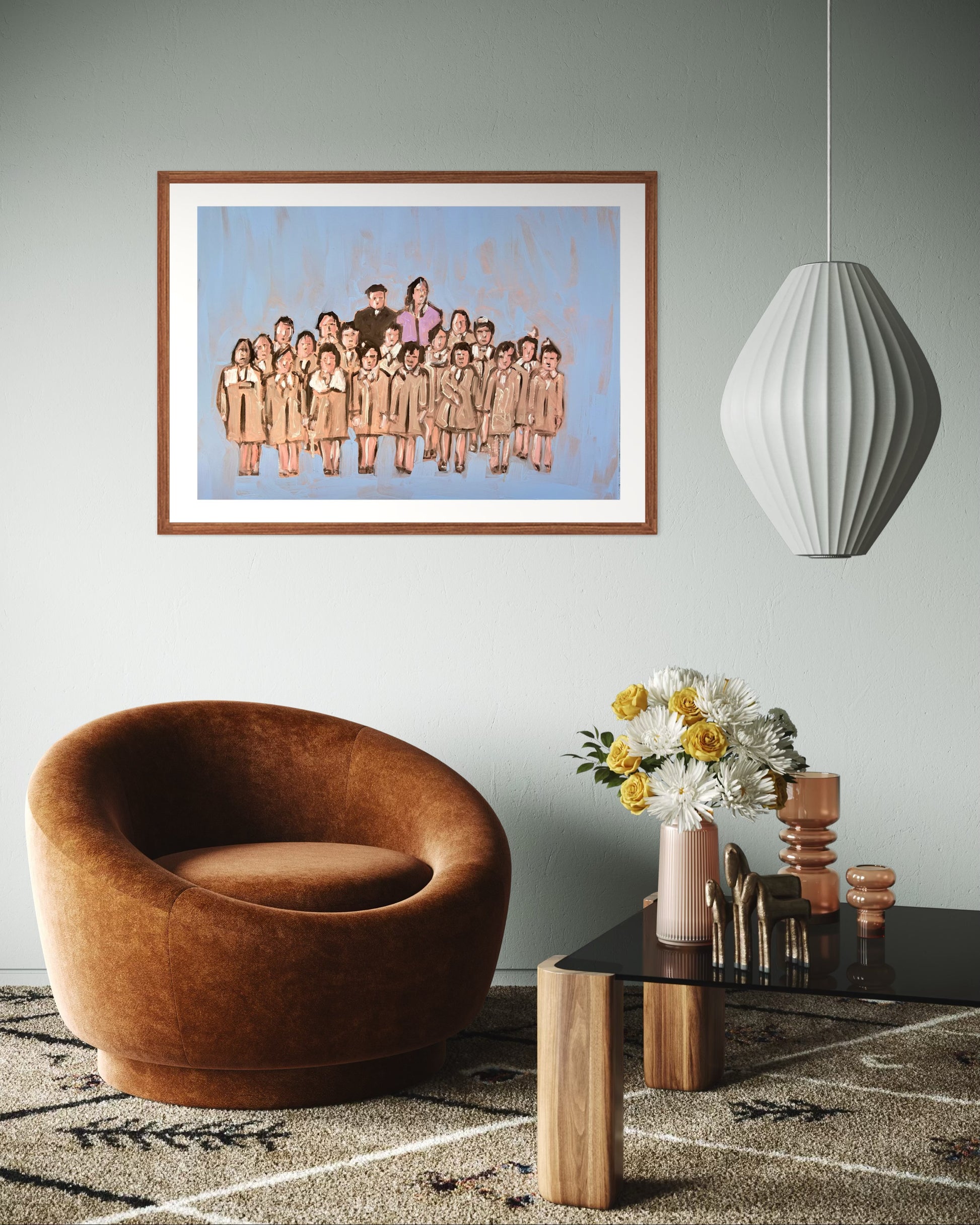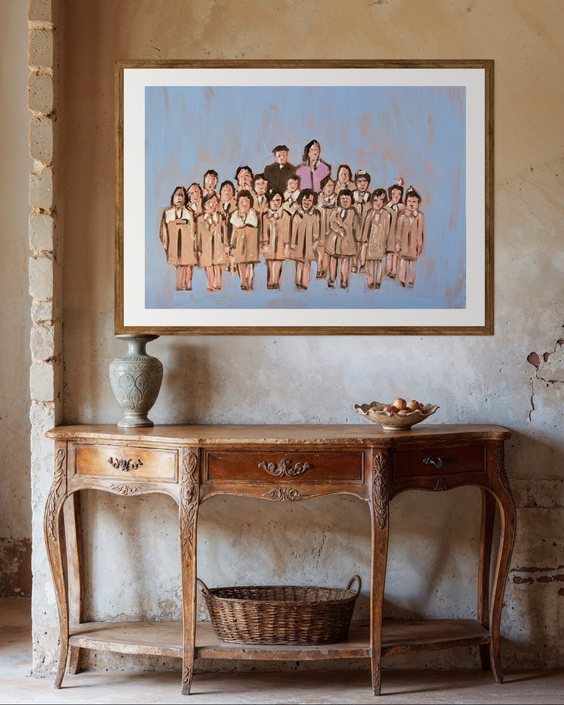 Un ricordo corale, sospeso tra memoria collettiva e poesia visiva. Questa stampa giclée raffigura un gruppo di scolari e insegnanti, restituendo con delicatezza la forza dei legami che uniscono l’infanzia. I volti e i gesti, essenziali e vibranti, evocano una dimensione di appartenenza e identità condivisa.