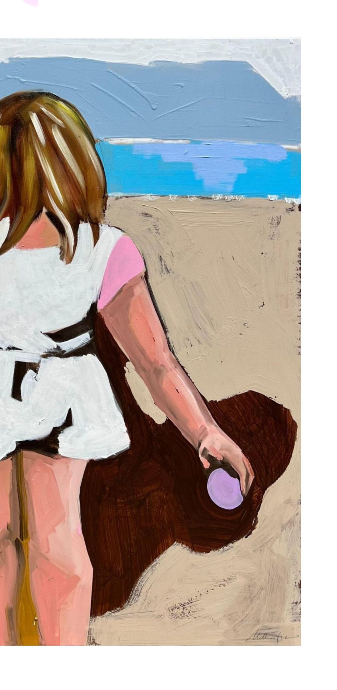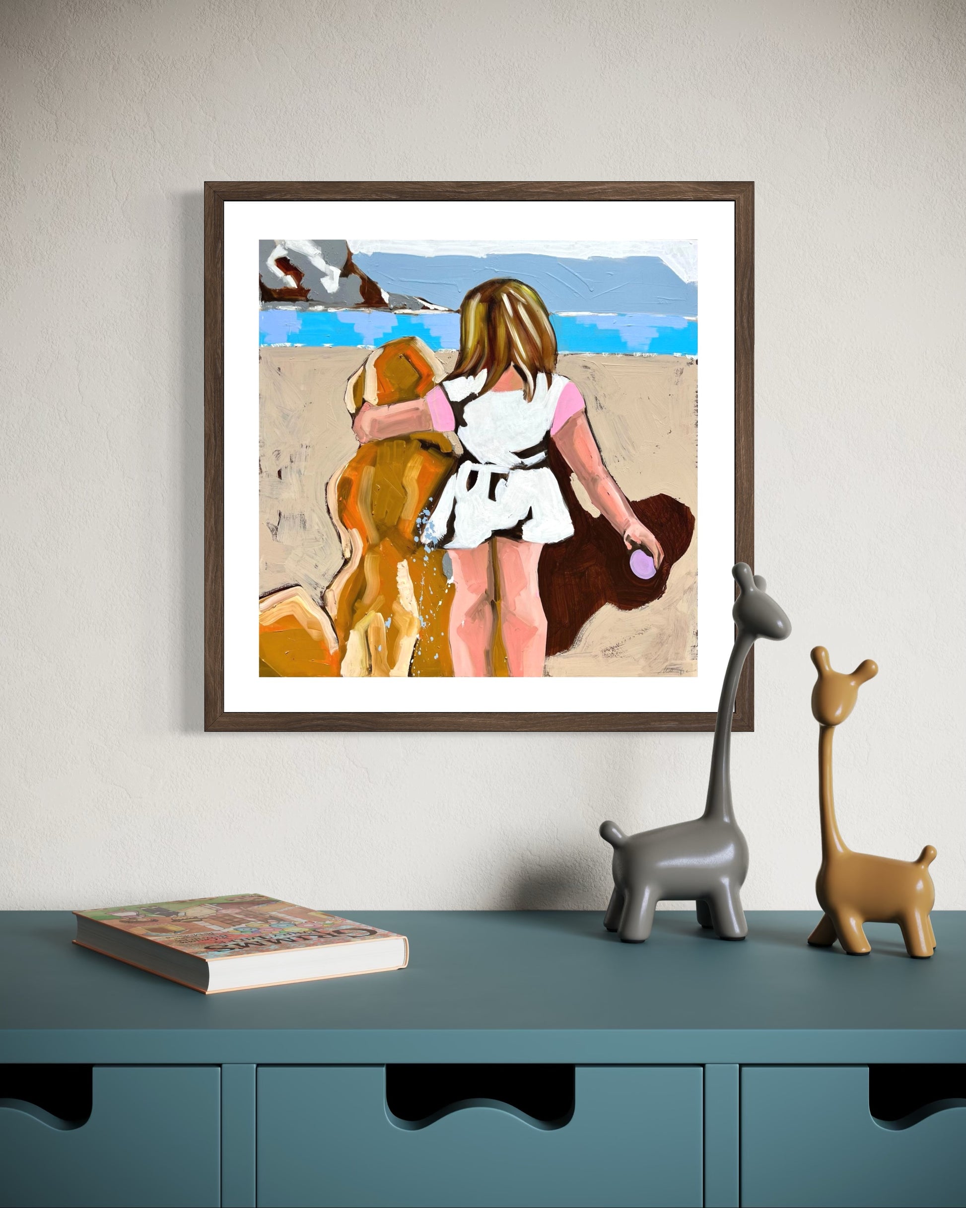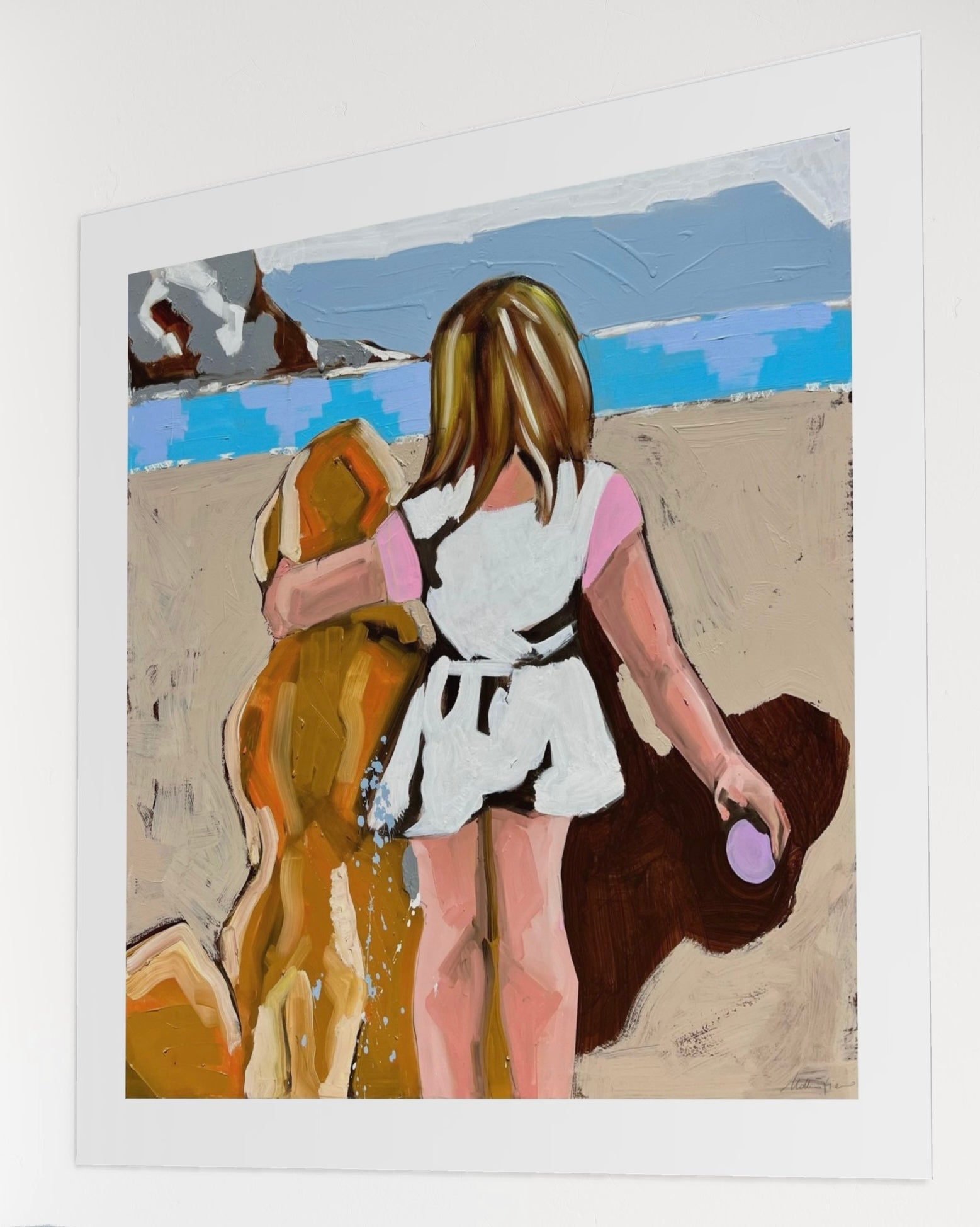 Una bambina cammina sulla sabbia accanto al suo cane, con lo sguardo rivolto verso il mare. La scena cattura un momento sospeso tra libertà e nostalgia, dove la luce estiva si mescola alla memoria.