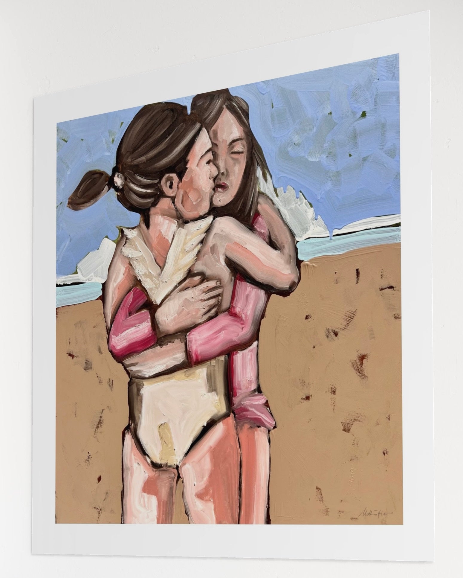 Un abbraccio sulla sabbia, tra la luce del mare e il silenzio dell'estate. In questa scena sospesa, ogni gesto diventa memoria: la pelle che si sfiora, il tempo che si ferma, l'amicizia che non chiede parole.