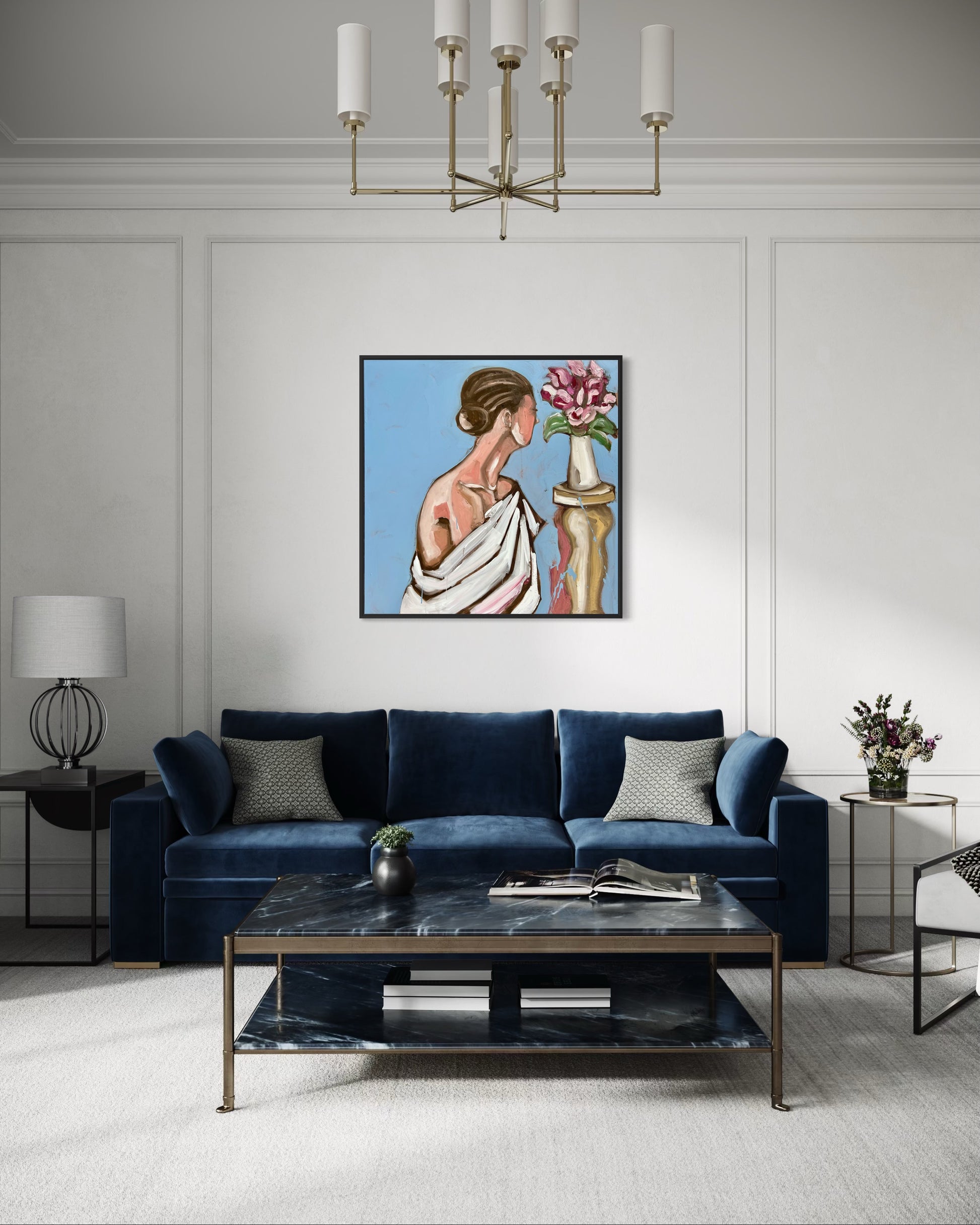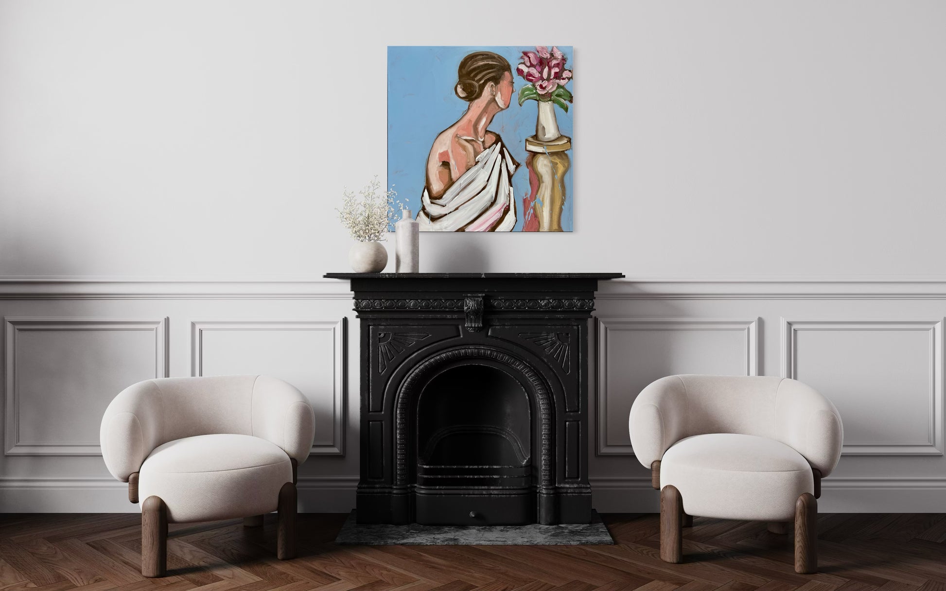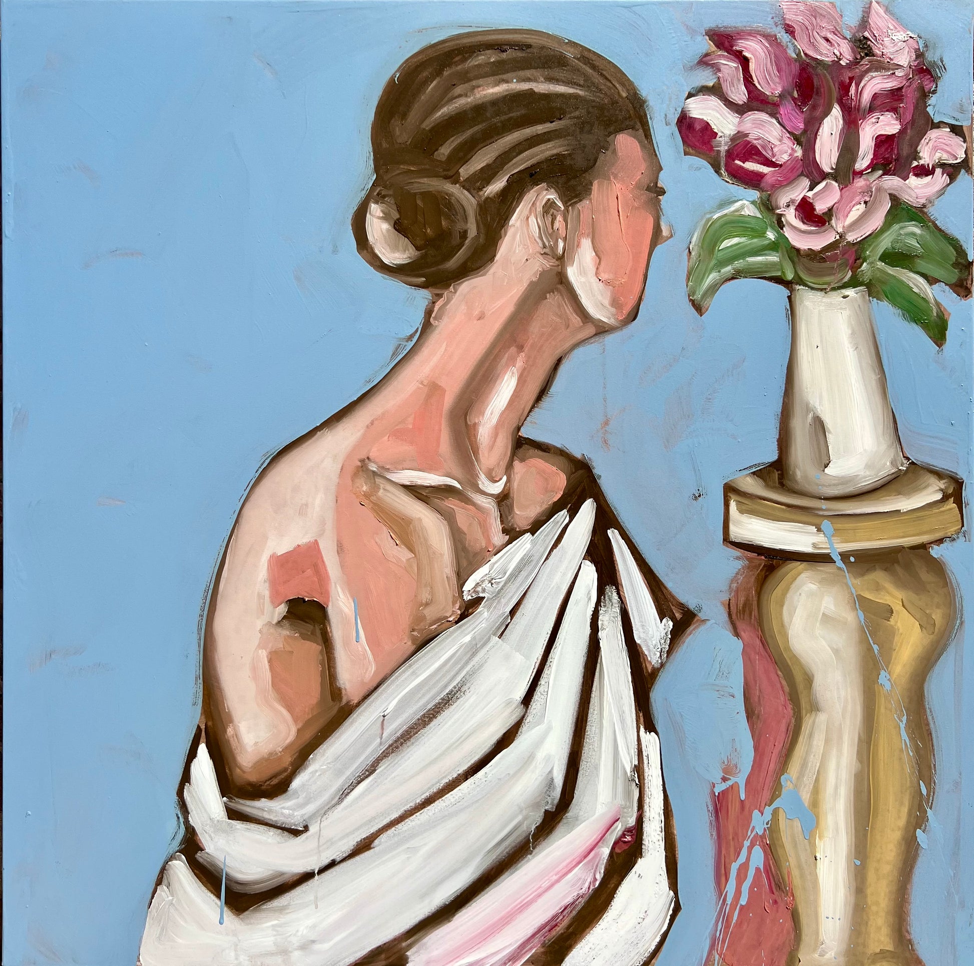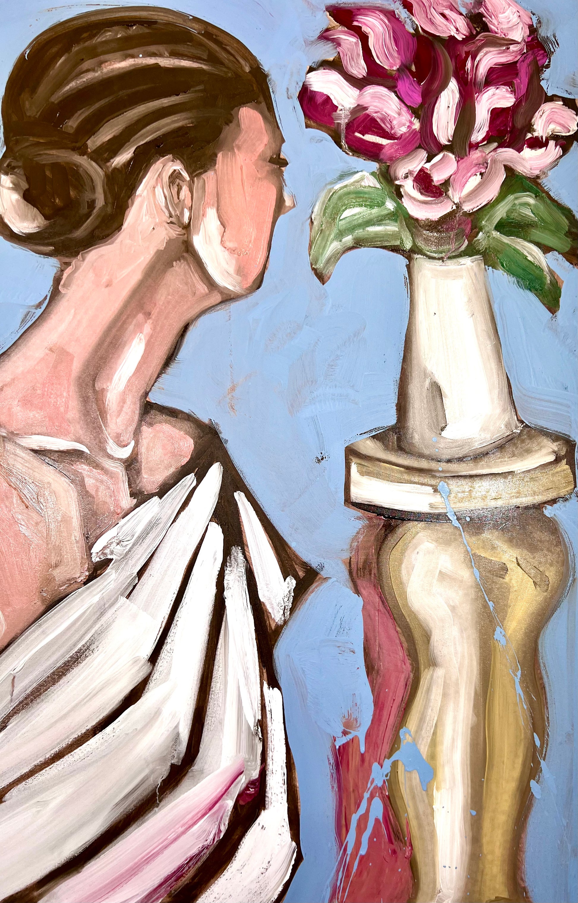Un profilo femminile assorto, rivolto verso un vaso di fiori: un gesto semplice che diventa simbolo di rinascita e contemplazione. L’opera esplora la delicatezza dell’attesa e la forza silenziosa del femminile, attraverso un equilibrio di luce, gesto e materia pittorica. Il contrasto tra la pelle calda e il fondo azzurro amplifica la sensazione di intimità e sospensione, mentre le pennellate dense restituiscono la fisicità del pensiero, come se ogni colore fosse un frammento di memoria.