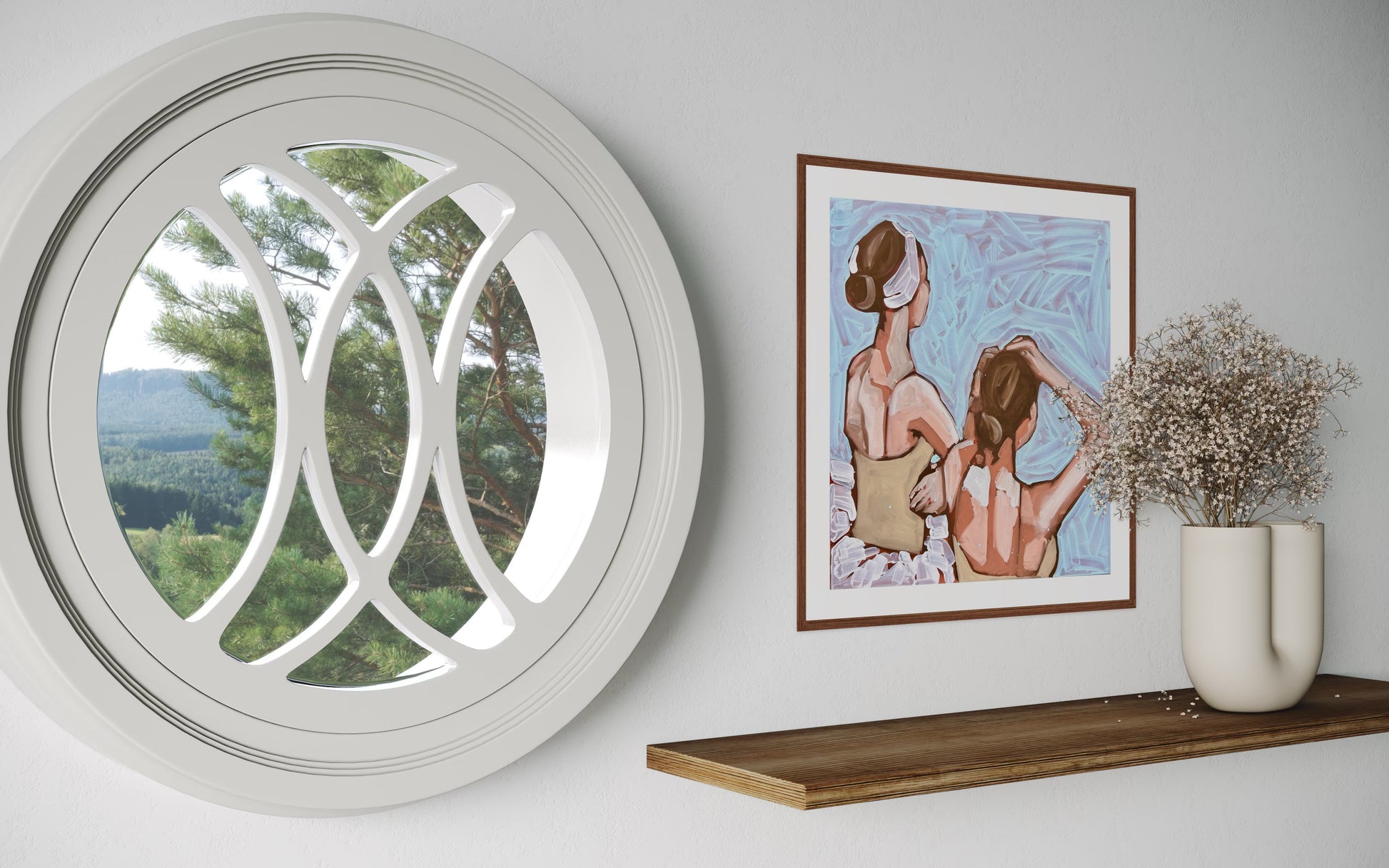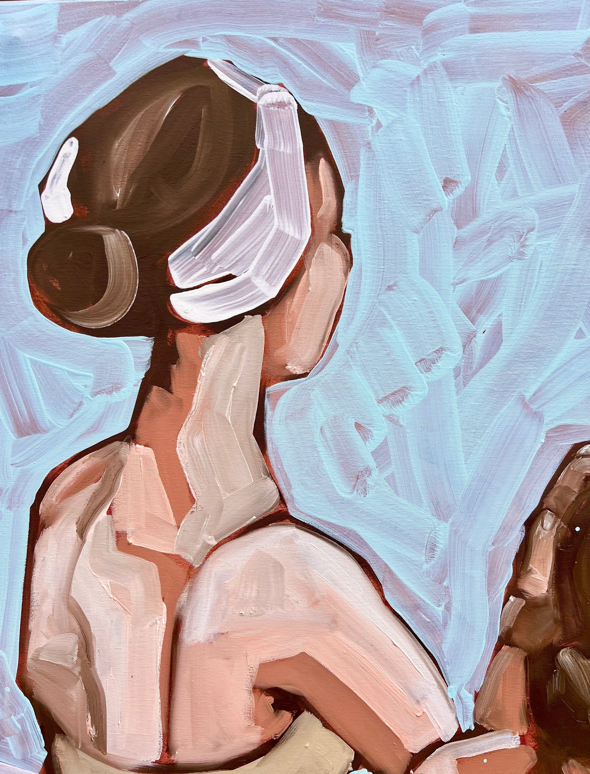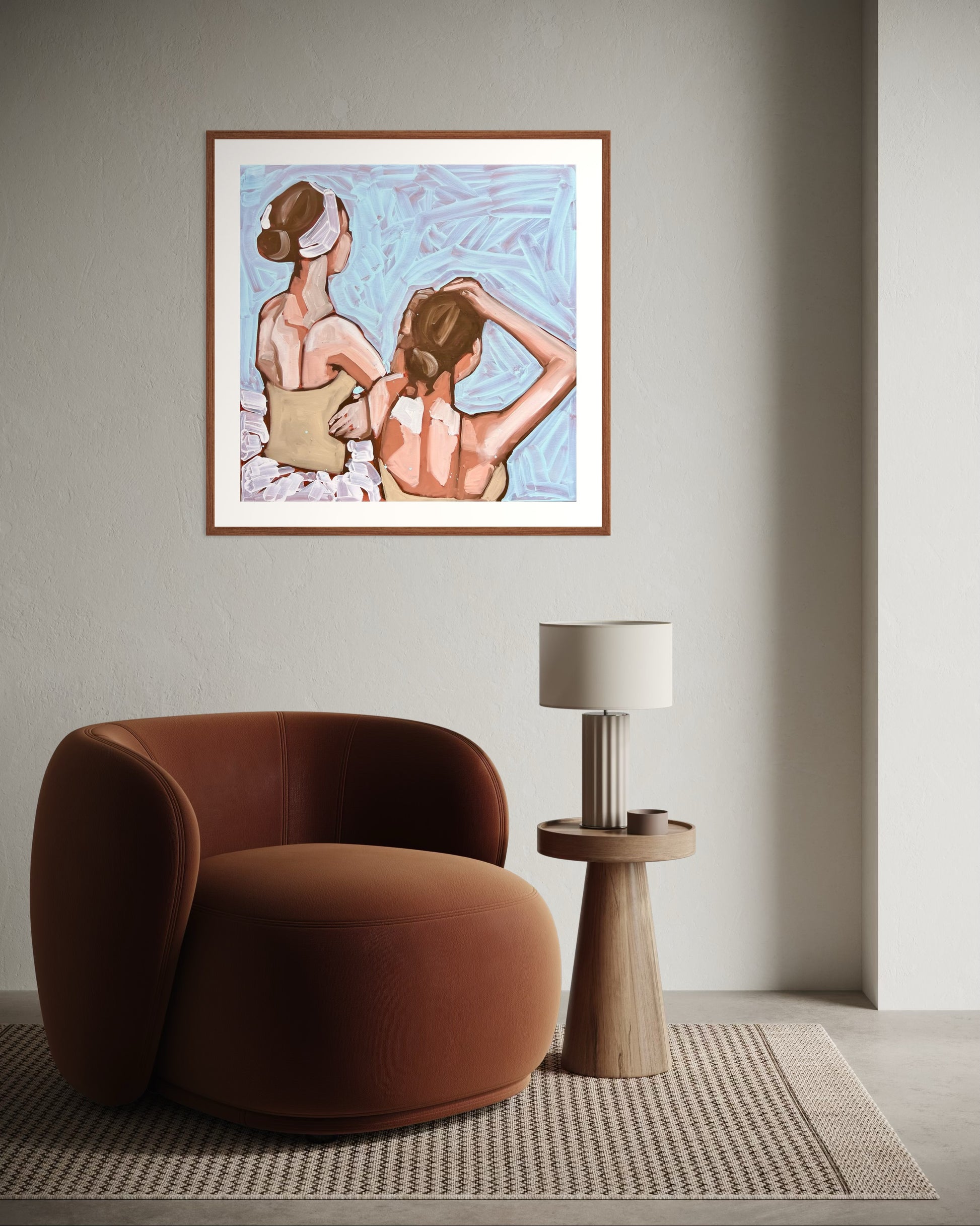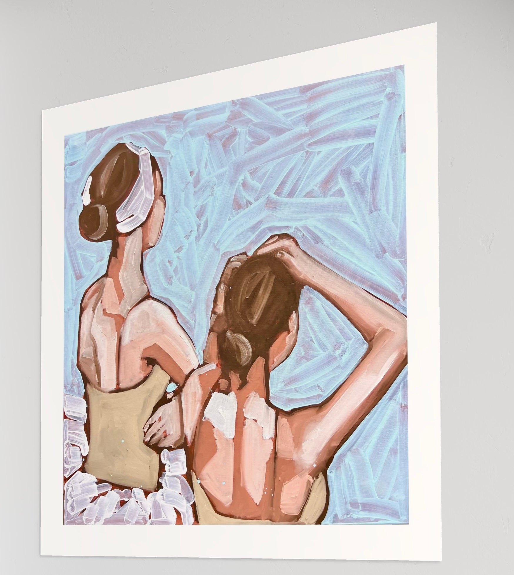Questa stampa giclée ritrae due ballerine viste di spalle, colte in un momento intimo di preparazione. La pennellata energica e materica esalta la luce che scivola sulla pelle e sui gesti, trasformando la scena in un frammento di poesia visiva.