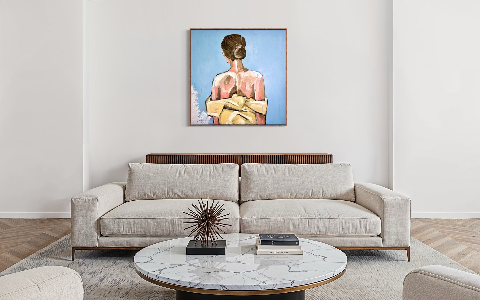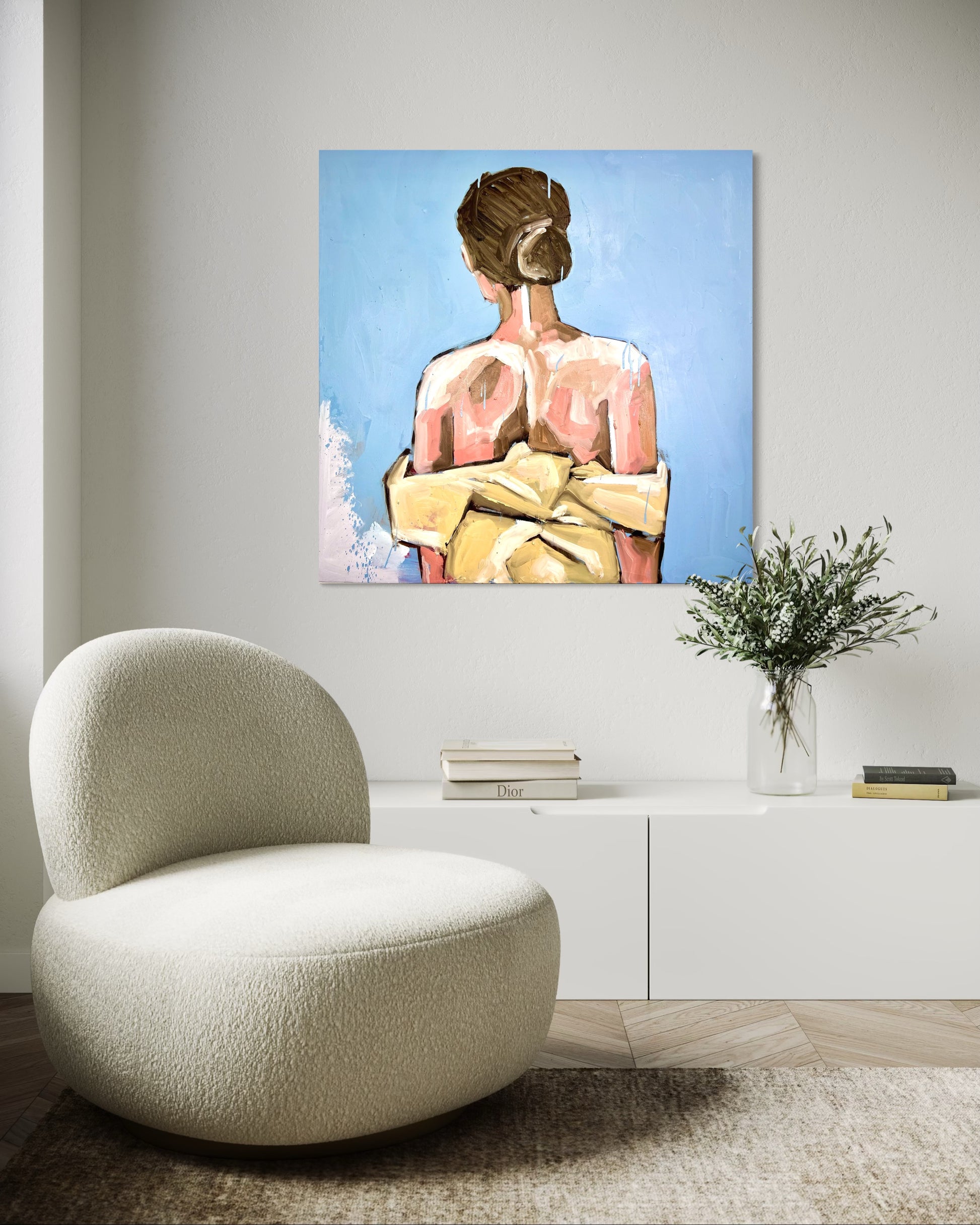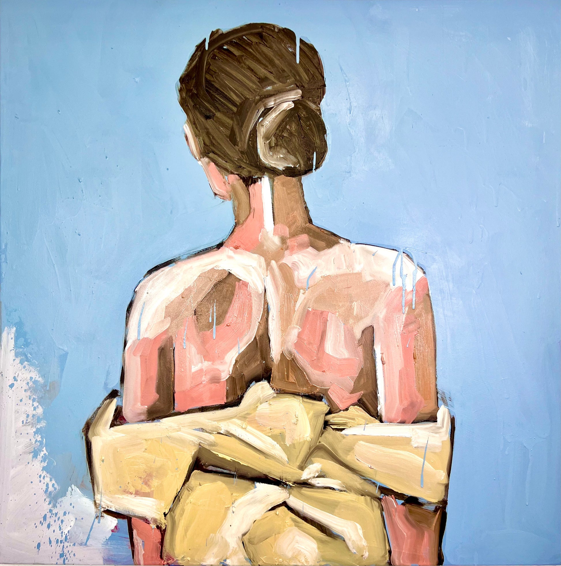 Una figura femminile di spalle, avvolta in un drappo color miele, si staglia contro un cielo limpido. L’opera cattura l’istante in cui il silenzio diventa linguaggio: una presenza quieta, forte e vulnerabile al tempo stesso. La luce accarezza la pelle e le spalle nude, creando una tensione delicata tra intimità e distanza, tra realtà e memoria.